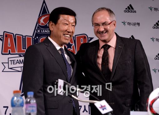 [신문로=아시아경제 김현민 기자] 프로축구 K리그 올스타전 출전선수 발표 기자회견이 2일 서울 신문로 축구회관에서 열렸다. 최강희 감독(왼쪽)과 슈틸리케 감독이 미소짓고 있다.