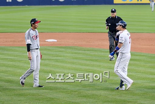 그런데 갑자기 1루로 출루한 오재원이 우규민과 실랑이를 벌이기 시작했다. 1루에 출루한 오재원이 우규민에게 '공에 맞았다'고 주장했고, 우규민은 오재원에게 '몸에 맞지 않았다'며 맞섰다.