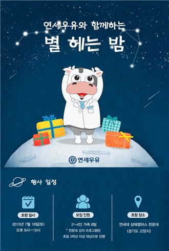 [아시아경제 최서연 기자] 연세대학교 연세우유가 오는 18일 경기 고양시 연세대학교 삼애캠퍼스 천문대에서 '연세우유와 함께 하는 별 헤는 밤' 프로모션을 진행한다고 3일 밝혔다.