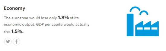가장 눈에 띄는 건 경제적 변화다. 그리스가 나가도 유로존은 전체 경제의 1.8%를 잃는 데 그칠 뿐이다. 오히려 1인당 국내총생산(GDP)은 1.5% 상승할 것으로 전망된다. 반대로 말하면 그리스가 유로존 전체의 GDP를 깎아먹고 있었다는 뜻이다. 재정 상태도 좋아진다. 공공부채의 3.4%가 줄고, 민간부채는 0.9% 줄어든다.