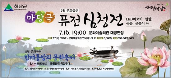 [아시아경제 노해섭 ]해남군(군수 박철환)은 오는 7월16일 오후 7시 문화예술회관 대공연장에서 마당극 ‘퓨전 심청전’공연을 실시한다.