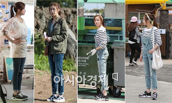 강소라는 드라마 배경지가 제주도인만큼 여름 바다와 잘 어울리는 세련된 트레이닝 룩을 통해 그녀의 날씬한 몸매와 건강한 매력을 발산했다. 여름철 자외선 차단 효과를 제공하는 깔끔한 화이트 컬러의 트레이닝 상의에 뛰어난 신축성으로 편안한 착용감을 더하는 티셔츠를 이너 웨어로 선택했으며, 여기에 스포티한 디자인의 바지 결합형 레깅스 또는 우븐 숏팬츠가 결합된 4부 레깅스와 샌들 ‘시티 크루즈’를 매치해 그녀의 완벽한 각선미를 돋보이게 하는 여름 패션을 완성했다.
