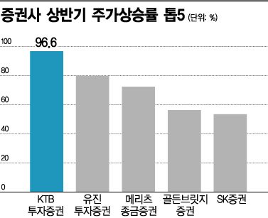 10일 금융정보업체 에프앤가이드에 따르면 국내 증시에 상장된 22개 증권사의 올 상반기 평균 주가상승률은 36%로 집계됐다. 이는 같은 기간 코스피 지수상승률(8.28%)을 4배 이상 웃도는 수치다. KTB투자증권이 주가상승률 96%로 1위를 기록했다. 이어 유진투자증권(79%)과 메리츠종금증권(72%) 순이었다. 주가가 하락한 종목(유화증권ㆍ신영증권)은 단 두 종목에 불과했다. 꼴찌를 기록한 신영증권도 하락폭이 -3.19%로 크지는 않았다.