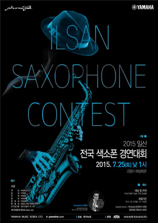 이번 2015 야마하 전국 색소폰 경연대회의 지역 예선은 오는 25일 일산을 시작으로 9월, 10월, 11월중에 진행될 예정이다. 최종 결선은 내년 1월 서울에서 개최된다. 대상, 최우수상, 우수상, 장려상 등 입상자에게는 고급 야마하 색소폰이 상품으로 증정된다.