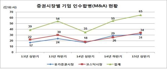 한국예탁결제원은 상반기 M&A를 완료했거나 진행 중인 상장사가 총 65개사로 작년 상반기(35곳)보다 85.7% 증가했다고 23일 밝혔다.
