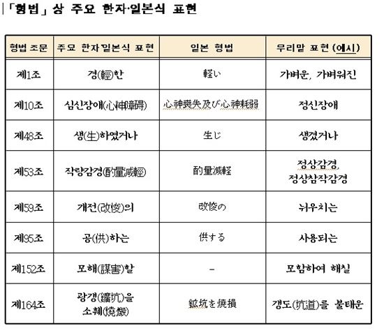 1953년 제정된 형법에는 '생(生)하였거나(우리말 표현:생겼거나)'와 같은 일본식 표현이나 곳곳에 남아 있어, 이를 쉬운 우리말로 바꿀 필요가 있다는 지적이 꾸준히 제기돼 왔다.