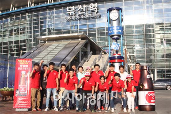 동아오츠카 임직원들이 지난 25일 부산역에서 '오로나민C' 100만 샘플링을 기념해 화이팅을 외치고 있다. 오로나민C는 레몬 11개에 준하는 비타민C와 비타민 B2, B3, B6, 필수아미노산 3종류를 함유하고 있어 하루에 필요한 종합 비타민 섭취가 가능하다. 벌꿀과 탄산수가 들어 있어 부드러운 상쾌함을 제공하는 것도 이 제품의 특징이다.