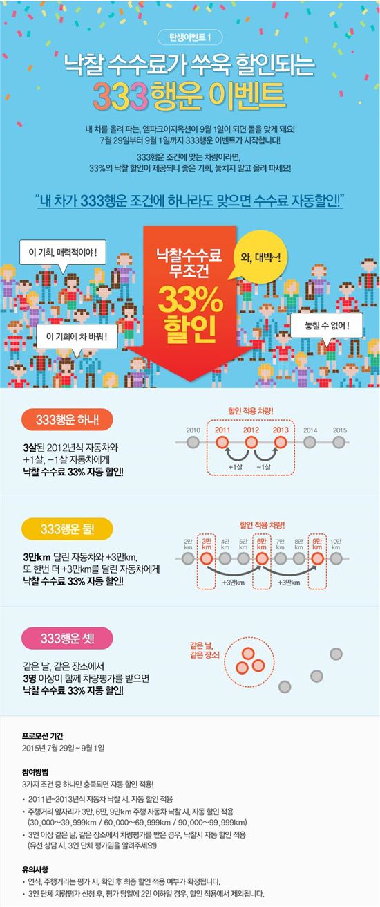 김찬영 엠파크이지옥션 사업본부 부장은 “이번 333 행운 이벤트는 엠파크이지옥션론칭 1주년을 맞이하며 그간 고객들이 보내주신 성원에 보답하기 위해 기획했다”며 “다양한 참여자들의 여러 가지 차량 조건에도 할인 적용이 가능한만큼 쉽고 알뜰하게 내 차를 팔 수 있는 좋은 기회가 될 것”이라고 말했다.