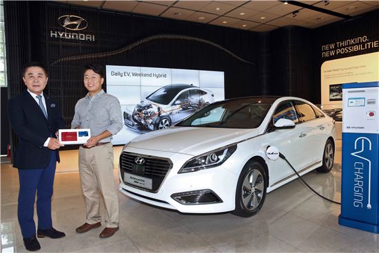 현대차는 이날 오전 서울시 강남구 영동대로에 위치한 국내영업본부 사옥에서 현대자동차 국내영업본부장 곽진 부사장을 비롯한 임직원이 참석한 가운데 '쏘나타 PHEV 1호차 전달식'을 가졌다.