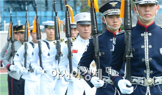 [아시아경제 양낙규 기자]각 나라를 대표하는 국방장관 등이 방한하면 우리 군은 예우를 갖춘다. 바로 의전행사다. 의전행사는 우리 군의 전통성을 한눈에 보여주고 다른 나라 군을 존중한다는 의미를 담는다. 의전행사를 이끄는 이들이 바로 국방부 근무지원단 의장대대 장병들이다. 절도있는 행동과 옷맵시는 행사에 참여한 이들의 마음을 단숨에 빼앗아버린다. 의장대대 장병들의 화려한 모습을 보기 위해 지난달 12일 서울 용산구 국방부청사내 연병장을 찾았다.