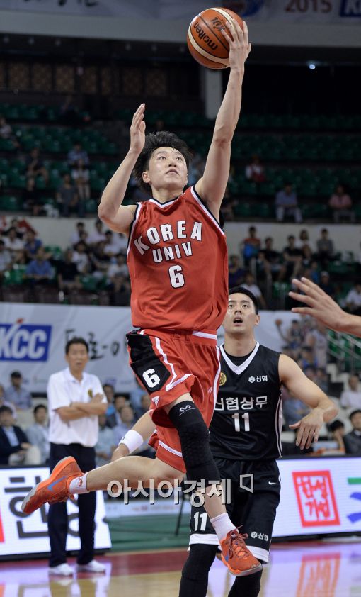 [잠실=아시아경제 김현민 기자] 2015 KCC 프로-아마 최강전 상무와 고려대학교의 경기가 19일 잠실학생체육관에서 열렸다. 고려대 최성모가 상무 수비를 뚫고 슛하고 있다.