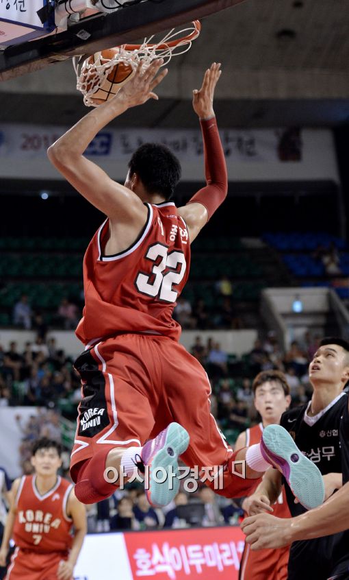 [잠실=아시아경제 김현민 기자] 2015 KCC 프로-아마 최강전 상무와 고려대학교의 경기가 19일 잠실학생체육관에서 열렸다. 고려대 이종현이 상무 수비를 뚫고 호쾌한 덩크슛을 성공시키고 있다.