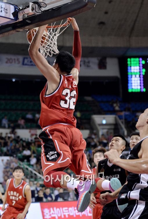 [잠실=아시아경제 김현민 기자] 2015 KCC 프로-아마 최강전 상무와 고려대학교의 경기가 19일 잠실학생체육관에서 열렸다. 고려대 이종현이 상무 수비를 뚫고 호쾌한 덩크슛을 성공시키고 있다.