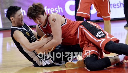 [잠실=아시아경제 김현민 기자] 2015 KCC 프로-아마 최강전 상무와 고려대학교의 경기가 19일 잠실학생체육관에서 열렸다. 고려대 강상재가 상무 최진수와 루즈볼을 다투고 있다.