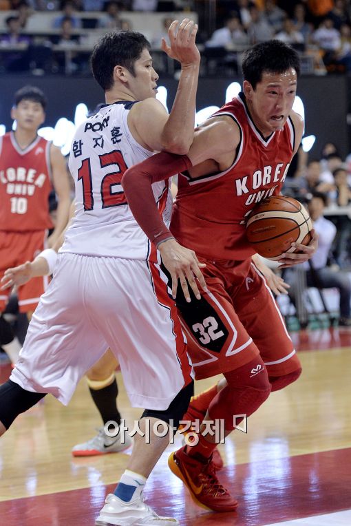 [잠실=아시아경제 김현민 기자] 2015 KCC 프로-아마 최강전 울산 모비스와 고려대학교의 경기가 21일 잠실학생체육관에서 열렸다. 고려대 이종현이 모비스 함지훈의 수비를 뚫고 공격하고 있다.