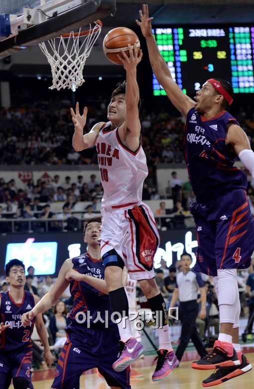[잠실=아시아경제 김현민 기자] 2015 KCC 프로-아마 최강전 고양 오리온스와 고려대학교의 결승전이 22일 잠실학생체육관에서 열렸다. 고려대 문성곤이 오리온스 문태종의 수비를 뚫고 공격하고 있다.