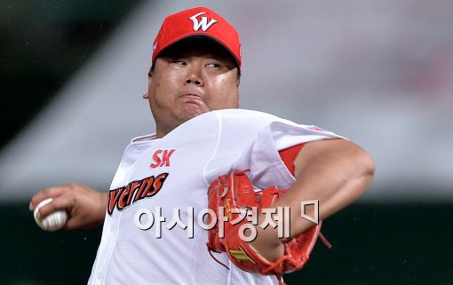 [인천=아시아경제 김현민 기자] 2015 KBO리그 KIA 타이거즈와 SK 와이번스의 경기가 25일 문학야구장에서 열렸다. SK 선발 박희수에 이어 마운드에 오른 채병용이 역투하고 있다.