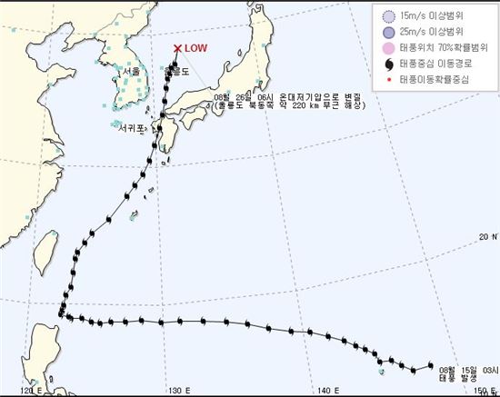 기상청은 26일 울릉도 북동쪽 약 220km 부근 해상에서 태풍 고니가 온대저기압으로 변질돼 소멸했다고 밝혔다.