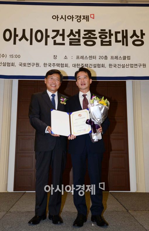 [아시아경제 백소아 기자] 26일 서울 태평로 프레스센터에서 아시아경제 신문 주최로 열린 제 10회 아시아건설종합대상 시상식에서 해외건축부문 대상을 수상한 쌍용건설을 대표해 최세영 부장(오른쪽)과 시상자 정내삼 대한건설협회 부회장이 기념사진촬영을 하고 있다.