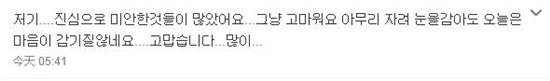 이날 그의 진심어린 글을 접한 팬들은 "미안해하지 마요", "늘 고마워요", "기다리고 있을게요" 등의 글로 그를 위로했다.