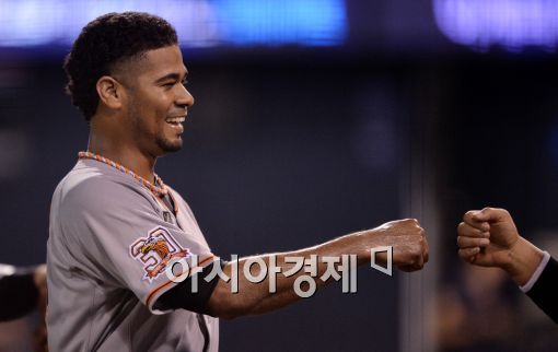 [창원=아시아경제 김현민 기자] 2015 KBO리그 한화 이글스와 NC 다이노스의 경기가 27일 마산야구장에서 열렸다. 한화 선발투수 로저스가 5회말 2사 1,2루에서 NC 지석훈을 삼진으로 처리한 뒤 조인성 포수와 하이파이브하고 있다.