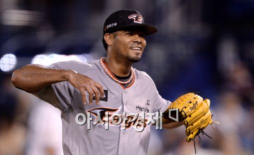[창원=아시아경제 김현민 기자] 2015 KBO리그 한화 이글스와 NC 다이노스의 경기가 27일 마산야구장에서 열렸다. 한화 선발투수 로저스가 5회말 2사 1,2루에서 NC 지석훈을 삼진으로 처리한 뒤 미소짓고 있다.