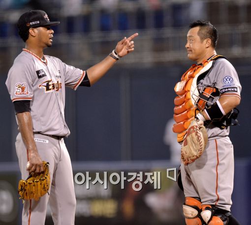 [창원=아시아경제 김현민 기자] 2015 KBO리그 한화 이글스와 NC 다이노스의 경기가 27일 마산야구장에서 열렸다. 한화 선발 로저스가 6회말 2사 2,3루의 위기에서 마운드로 올라온 조인성과 이야기를 나누고 있다.