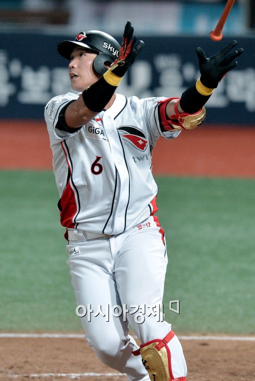 [수원=아시아경제 김현민 기자] 2015 KBO리그 KIA 타이거즈와 kt 위즈의 경기가 28일 수원야구장에서 열렸다. 4회말 무사 2,3루에서 kt 박경수가 KIA 김광수를 상대로 선제 3점 홈런을 치고 있다.