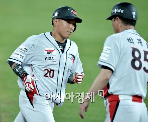 [수원=아시아경제 김현민 기자] 2015 KBO리그 KIA 타이거즈와 kt 위즈의 경기가 28일 수원야구장에서 열렸다. 8회말 무사 1루에서 kt 윤요섭이 KIA 문경찬을 상대로 추가 투런 홈런을 치고 박계원 코치와 하이파이브하고 있다.