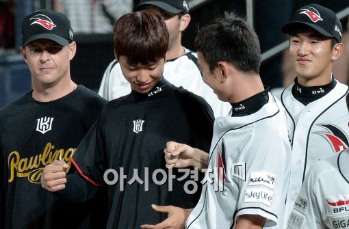 [수원=아시아경제 김현민 기자] 프로야구 kt 위즈가 28일 수원야구장에서 열린 2015 KBO리그 KIA 타이거즈와의 경기에서 10-0으로 이겼다. 7이닝 무실점으로 시즌 세 번째 승을 챙긴 선발 엄상백이 동료들과 기쁨을 나누고 있다.
