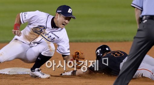 [잠실=아시아경제 김현민 기자] 2015 KBO리그 한화 이글스와 두산 베어스의 경기가 30일 잠실야구장에서 열렸다. 5회초 1사 1루에서 한화 김태균 타석 때 도루를 시도한 1루주자 정근우가 두산 최주환에게 태그아웃되고 있다.