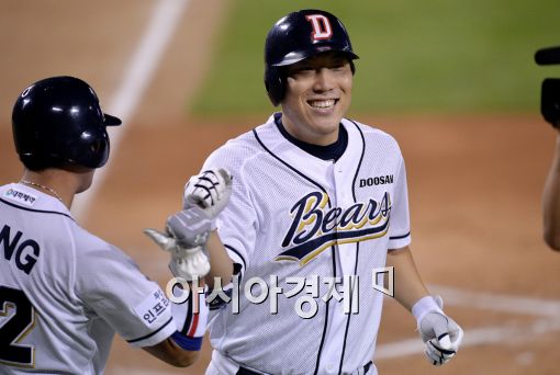 [잠실=아시아경제 김현민 기자] 2015 KBO리그 한화 이글스와 두산 베어스의 경기가 30일 잠실야구장에서 열렸다. 8회말 1사 1루에서 두산 김현수가 한화 권혁을 상대로 중월 동점 투런 홈런을 치고 기뻐하고 있다.