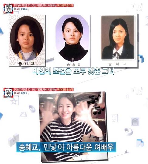 이날 방송에서는 4위를 차지한 송혜교의 어린 시절 사진이 공개됐다. 자연미인 송혜교는 졸업사진에서도 변함없는 미모를 과시해 눈길을 끌었다.