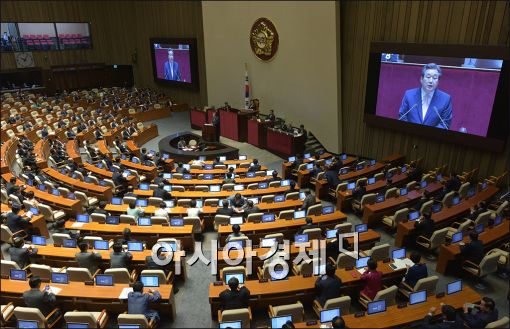 [아시아경제 윤동주 기자] 김무성 새누리당 대표가 2일 서울 여의도 국회 본회의장에서 교섭단체 대표 연설을 하고 있다.