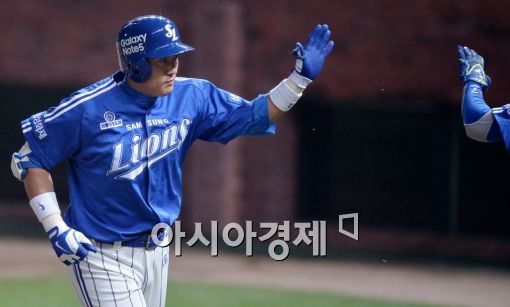 [인천=아시아경제 김현민 기자] 2015 KBO리그 삼성 라이온즈와 SK 와이번스의 경기가 4일 문학야구장에서 열렸다. 8회초 삼성 선두타자 이승엽이 SK 선발 김광현을 상대로 우월 솔로 홈런을 치고 대기타석의 채태인과 하이파이브하고 있다.