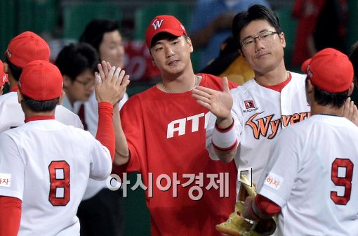 [인천=아시아경제 김현민 기자] 2015 KBO리그 삼성 라이온즈와 SK 와이번스의 경기가 4일 문학야구장에서 열렸다. 8이닝 1실점으로 활약하며 팀의 9-1승리에 기여한 김광현이 동료들과 기쁨을 나누고 있다.