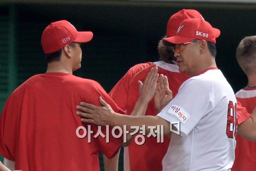[인천=아시아경제 김현민 기자] 2015 KBO리그 삼성 라이온즈와 SK 와이번스의 경기가 4일 문학야구장에서 열렸다. 8이닝 1실점으로 활약하며 팀의 9-1승리에 기여한 김광현이 김용희 감독과 기쁨을 나누고 있다.