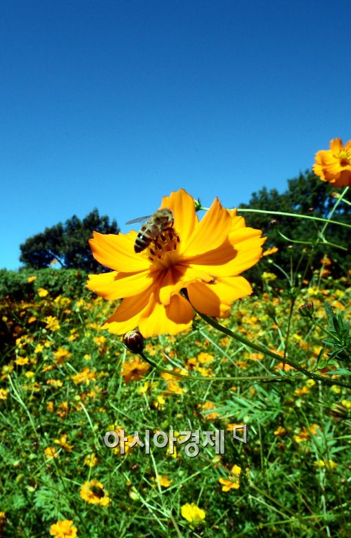 [아시아경제 최우창 기자] 절기상 아침 이슬이 내린다는 백로인 8일 서울 송파구 올림픽공원 들꽃마루에서 청명한 파란 가을 하늘 아래 활짝 핀 황화코스모스가 가을을 반기고 있다.