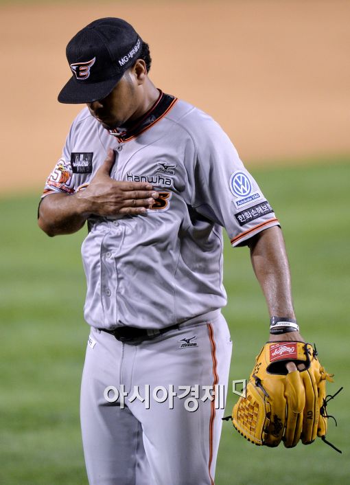 [잠실=아시아경제 김현민 기자] 2015 KBO리그 한화 이글스와 LG 트윈스의 경기가 8일 잠실야구장에서 열렸다. 한화 선발 로저스가 7회말 2사에서 LG 양석환을 중견수 뜬공으로 처리한 뒤 가슴을 치며 세리머니하고 있다.
