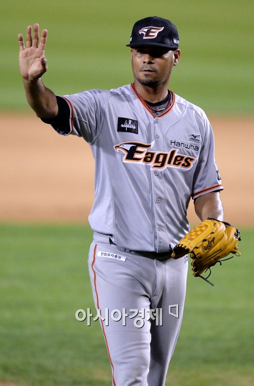 [잠실=아시아경제 김현민 기자] 2015 KBO리그 한화 이글스와 LG 트윈스의 경기가 8일 잠실야구장에서 열렸다. 한화 선발 로저스가 8회말 2사 1,2루의 위기에서 조인성 포수에게 다가가다 더그아웃을 향해 손짓하고 있다.