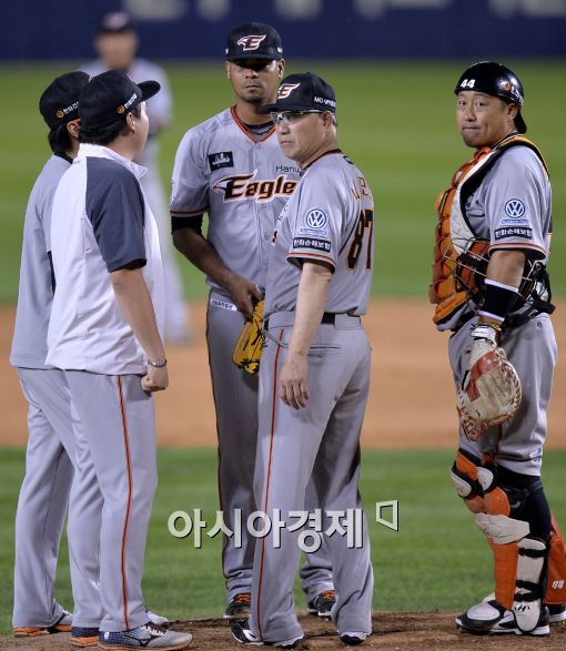 [잠실=아시아경제 김현민 기자] 2015 KBO리그 한화 이글스와 LG 트윈스의 경기가 8일 잠실야구장에서 열렸다. 한화 선발 로저스가 9회말 무사 1루에서 마운드로 올라온 니시모토 코치와 더그아웃을 바라보고 있다. 로저스는 128개의 공을 던지며 8이닝 3자책으로 활약했다.