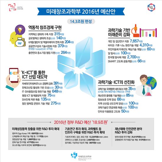 [아시아경제 강희종 기자]미래창조과학부는 2016년 예산을 올해 14조3383억원보다 71억원 감액된 14조3313억원으로 편성됐다고 10일 밝혔다.