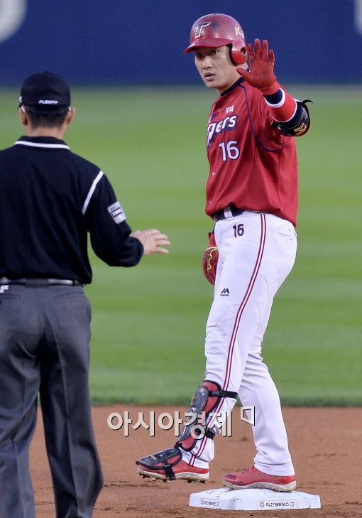 [잠실=아시아경제 김현민 기자] 2015 KBO리그 KIA 타이거즈와 두산 베어스의 경기가 10일 잠실야구장에서 열렸다. 1회초 2사에서 KIA 김주찬이 좌중간 2루타를 치고 출루하고 있다.