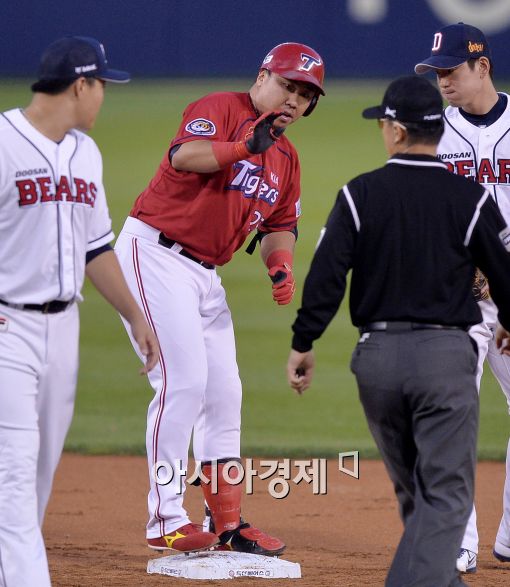 [잠실=아시아경제 김현민 기자] 2015 KBO리그 KIA 타이거즈와 두산 베어스의 경기가 10일 잠실야구장에서 열렸다. 2회초 KIA 선두타자 이범호가 가운데 담장을 맞추는 2루타를 치고 출루하고 있다.