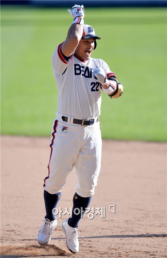 [잠실=아시아경제 김현민 기자] 2015 KBO리그 kt 위즈와 두산 베어스의 경기가 13일 잠실야구장에서 열렸다. 7회말 1사 1,2루에서 두산 대타 홍성흔이 2-2 균형을 깨는 1타점 적시타를 치고 기뻐하고 있다.