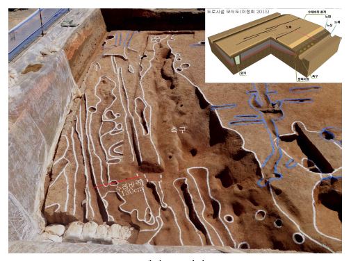 도로시설로는 도로와 도로 남쪽의 배수로, 노면의 수레바퀴 흔적이 확인되었다. 배수로는 원지형을 굴착하여 조성하였으며 내부에는 목탄, 백제 토기, 기와 등의 유물이 다량 출토됐다. 수레바퀴 흔적은 두 바퀴의 너비가 130cm 정도이다. 이 도로시설은 백마강변에서 사비왕궁으로 향하는 동서도로로 추정되며, 사비도성의 가로체계의 일부이다.