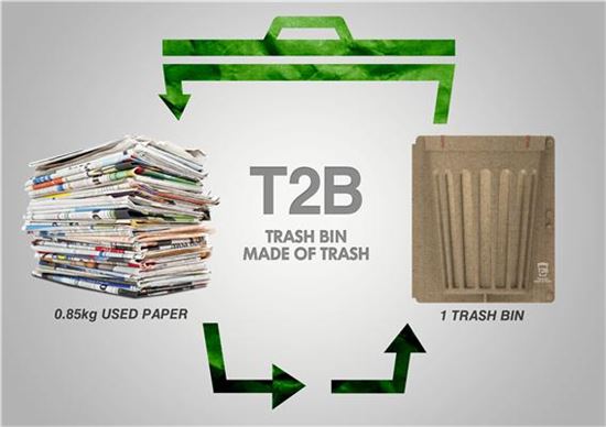 이번 대회 디자인 부문에서 은상을 차지한 T2B(Trash to Bin)는 쓰레기로 만든 쓰레기통 컨셉의 디자인으로 눈길이 집중됐다. 폐지를 재활용해 만든 T2B는 약 850g의 폐지로 제작됐다. 펄프화 시킨 폐지를 휴지통 모양의 틀을 이용해 간단한 압축공법으로 만들었다. 이어 습기에 대비하기 위해 해조류에서 추출된 코팅제를 사용해 방수코팅 과정을 거치면서 제품이 완성됐다.