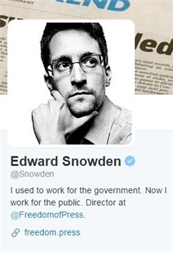 29일(현지시간) 미국 언론들에 따르면 스노든은 '@Snowden' 계정을 만들어 이날 오전부터 사용하기 시작했다. 트위터는 이 계정의 사용자가 스노든 본인임을 인정했다.