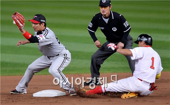 [인천=아시아경제 김현민 기자] 2015 KBO리그 LG 트윈스와 SK 와이번스의 경기가 30일 문학야구장에서 열렸다. 1회말 1사에서 SK 조동화가 좌익수 옆 2루타를 치고 출루하고 있다. LG 2루수는 손주인.