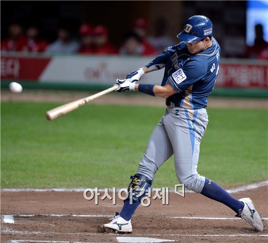 [인천=아시아경제 김현민 기자] 2015 KBO리그 NC 다이노스와 SK 와이번스의 경기가 2일 문학구장에서 열렸다. 6회초 1사 만루에서 NC 박민우가 추가 2타점 적시타를 치고 있다.